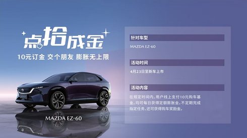目前,EZ-60“點(diǎn)拾成金”預(yù)訂政策正火熱進(jìn)行中。消費(fèi)者通過(guò)長(zhǎng)安馬自達(dá)官網(wǎng)、「悅馬星空」官方APP/小程序,或前往授權(quán)經(jīng)銷(xiāo)商,支付10元訂金,即可享受每天膨脹、上不封頂?shù)呐蛎浗穑敝列萝?chē)交付,膨脹金可直接抵扣車(chē)款。