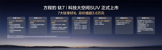 在購車權(quán)益上,方程豹更是誠意十足,為首批車主帶來了總價(jià)值最高超3.6萬元的7大鈦享好禮!其中包括:覆蓋多項(xiàng)座椅舒適配置的總價(jià)值10000元舒享升級(jí)包、價(jià)值3599元的BYD Pad套裝、價(jià)值4500元的新車交付禮包均免費(fèi)送;提供3年0息、5年低息、0首付起或至高84期等多重金融方案以供選擇,金融貼息最高價(jià)值11300元;還有最高價(jià)值6000元的置換補(bǔ)貼、價(jià)值900元的智慧生態(tài)禮包,以及2年5G每個(gè)月的免費(fèi)車機(jī)流量、非營運(yùn)車輛長達(dá)6年或15萬公里的整車包修、“三電”系統(tǒng)的終身保修、終身免費(fèi)系統(tǒng)OTA升級(jí)等,讓每一個(gè)家庭都能輕松擁抱鈦7,讓美好生活觸手可及。