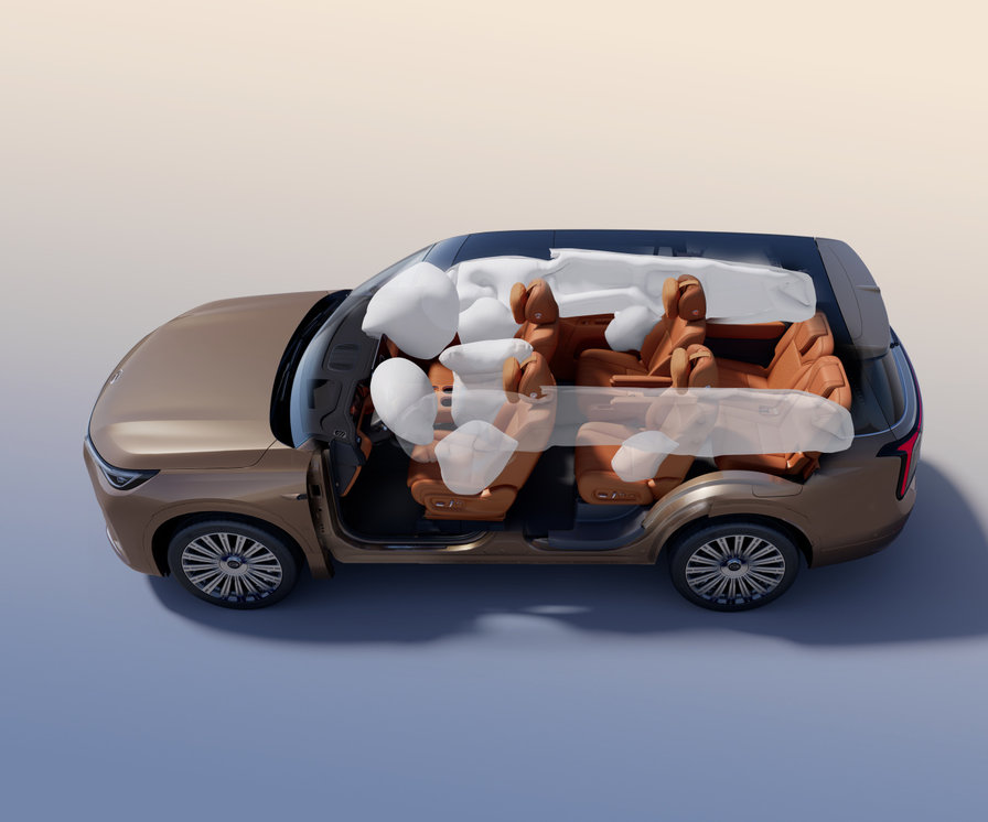 說到家庭用車,安全感必不可少。傳祺向往S9乾崑采用了“七環”籠式盾甲車身,乘員艙骨架全用高強度鋼,前防撞梁是航天級鋁合金,加上9個安全氣囊(含前排中央雙腔氣囊),發生碰撞時可有效保護車內乘員。