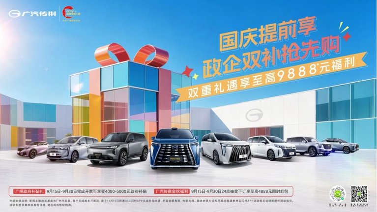 即日起到9月30日更有政企雙補貼,在廣州購車,且發(fā)票價在10萬到20萬元之間的能領4000元政府補貼,還有抽紅包活動,抽獎并下訂可享至高4888元傳祺金秋福利;