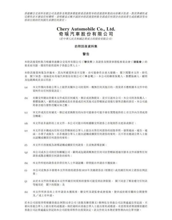 2025年9月7日,香港交易所官方網站正式發布公告,奇瑞汽車股份有限公司成功通過港交所聆訊。