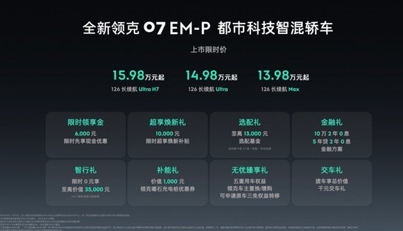 全新有為,極智新境。9月25日,都市科技智混轎車——全新領克07 EM-P正式上市。新車共推出126長續航Max、126長續航Ultra、126長續航Ultra H7三款配置版本,上市限時價13.98萬元起。同時,全新領克07 EM-P還準備了限時領享金、超享煥新禮、選配禮、金融禮、智行禮、補能禮、無憂臻享禮、交車禮在內的8重限時福利。