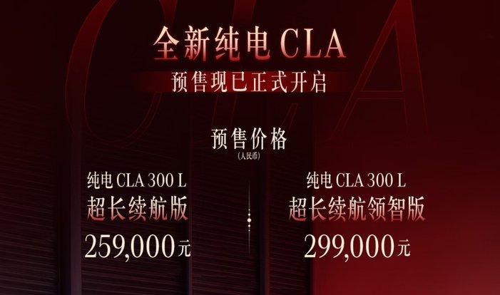 純電CLA 300 L超長續航版與純電CLA 300 L超長續航領智版,預售價分別為25.9萬元和29.9萬元。