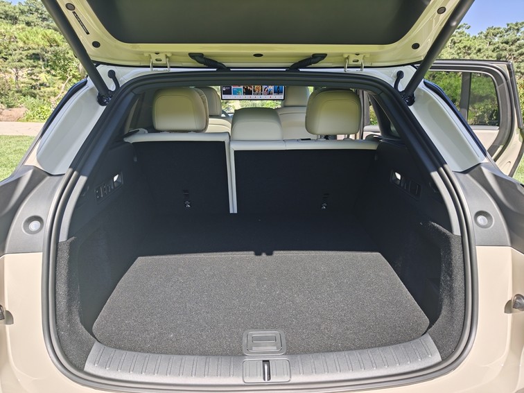 9、 后備箱空間非常大,進深1.1米、上半部分容積728L,下面還有一個下沉儲物格,沒有Model Y的大,但也小不了多少。