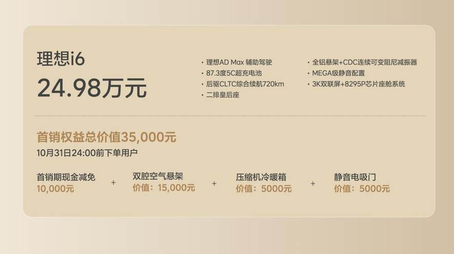 理想i6的官方零售價(jià)為24.98萬元,提供豐富的配置選擇,包括前后雙電機(jī)四驅(qū)系統(tǒng)、21.4英寸后艙娛樂屏、空氣懸架等可選配置。此外,理想i6還為用戶提供了豐富的定制選項(xiàng),包括外觀顏色、輪轂以及原廠拖掛套裝等。