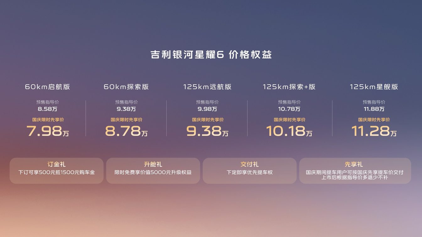 凡在預售期下訂吉利銀河星耀 6 的用戶,均可享 500 元抵 1500 元購車金、限時免費享價值 5000 元配置升級、優先提車權等豐厚權益。考慮到國慶假期將至,為滿足用戶早日提車出游的心愿,吉利銀河星耀6特別推出“國慶先享權益”:即日起至國慶前成功下訂,即可尊享國慶先享提車價7.98萬元起,并享受國慶前優先提車權益。據悉,吉利銀河星耀6將于10月正式上市。