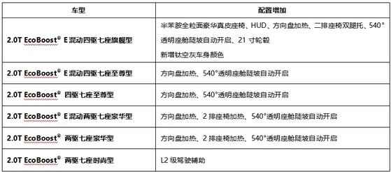 2.0T EcoBoost? 兩驅(qū)七座時(shí)尚型2.0T EcoBoost? 四驅(qū)七座時(shí)尚型2.0T EcoBoost? 兩驅(qū)七座豪華型2.0T EcoBoost? 四驅(qū)七座至尊型2.0T EcoBoost? E混動(dòng)兩驅(qū)七座豪華型2.0T EcoBoost? E混動(dòng)四驅(qū)七座至尊型2.0T EcoBoost? E混動(dòng)四驅(qū)七座旗艦型