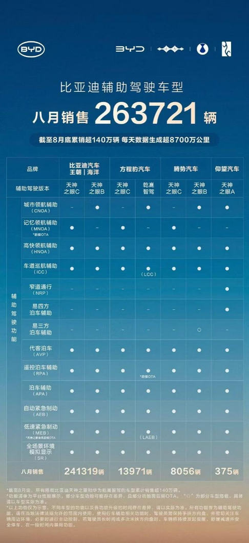 在太平洋汽車發布的8月智能駕駛輔助車型品牌銷量榜中,比亞迪以26.37萬輛一騎絕塵,其銷量相當于第2至第10名品牌之和。