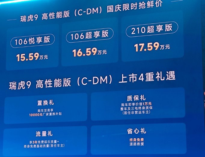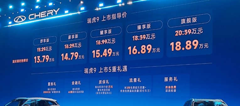 9月27日,新款瑞虎9家族上市,其中包括的車型有瑞虎9、瑞虎9X和瑞虎9 C-DM,售價(jià)方面三款不同的車系分別推出了國慶假期搶鮮價(jià),瑞虎9售價(jià)13.79到18.89萬元,瑞虎9X售價(jià)12.79到14.99萬元,瑞虎9 C-DM售價(jià)15.59到17.59萬元。