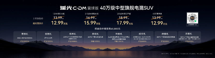 本次上市共有瑤光C-DM寰球版120長續航兩驅、210超長續航兩驅、200超長續航四驅 3款配置版型,指導價分別為13.99萬元、16.99萬元、18.99萬元。新車以40萬級豪華品質、40萬級豪華安全、40萬級豪華性能三大核心優勢,重新定義40萬級旗艦電混SUV價值標準。同時,星途還為青睞燃油車的消費者提供了燃油版車型瑤光400T寰球版,指導價13.99萬元。
