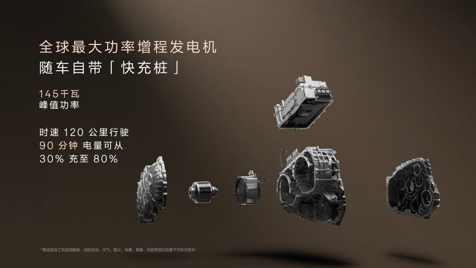 此外,極氪9X還搭載了全球最高功率145千瓦增程發電機,峰值功率高于多數國網快充樁。在時速120公里高速饋電工況下,SoC從30%到80%僅需90分鐘,邊開邊充電,越跑電越多。