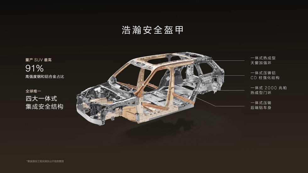 依托超標安全標準,極氪9X以全球最強車身安全體系打造浩瀚安全盔甲。白車身高強度鋼與鋁合金占比高達91%,搭載全球唯一“四大一體式集成安全結構”,實現同級最強41600N·m/deg車身扭轉剛度,并通過行業首個單車四向連環極限碰撞測試,成為豪華旗艦SUV領域的安全新標桿。