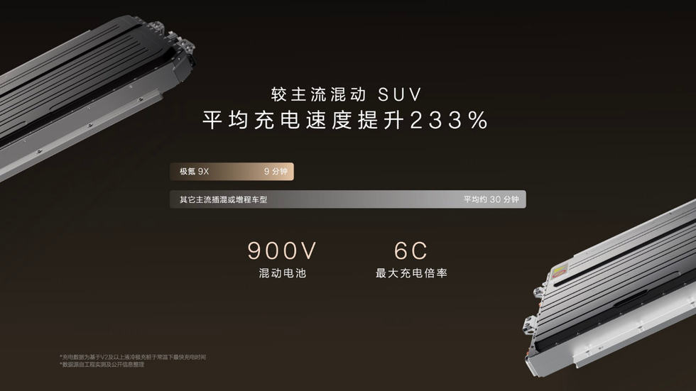 極氪9X全系采用與寧德時代聯合開發的900伏混動專用電池,提供兩種大電池方案。全球混動領域容量最高的70度大電池,純電續航里程達到380公里,全球插混產品中純電續航最高;起步版本也是同級最大55度電池,CLTC純電續航300公里。兩種電池方案均支持6C超快充,從20%充至80%僅需9分鐘,領先所有混動產品和99%的純電車型。