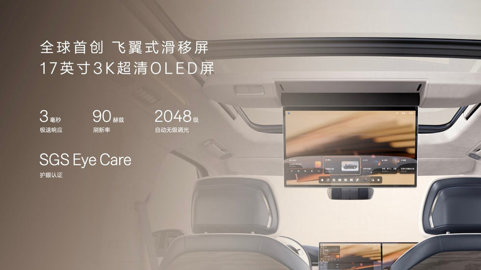 除了頂級音響,極氪9X還帶來全球首創的飛翼式滑移屏。這塊17英寸3K超清OLED屏由三星供應,可在二三排間電動無級滑移88厘米,并支持5檔角度調節,讓全車乘員都能舒適使用。其低藍光的護眼認證,也確保全家觀看無憂。