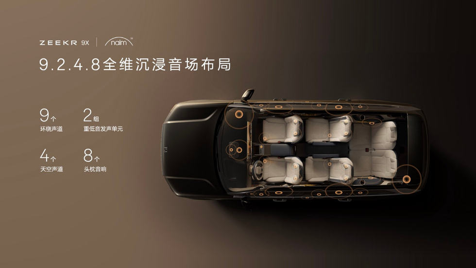 在極致的靜謐表現之上,極氪與英國皇室御用音響品牌Naim深度合作,為極氪9X聯手打造全球最大功率的車載音響。它擁有3868瓦的峰值功率,32個揚聲器,支持杜比全景聲,采用9個環繞聲道、4個天空聲道、8個頭枕音響及2個低音炮,讓每個座位都能享受殿堂級沉浸音效。