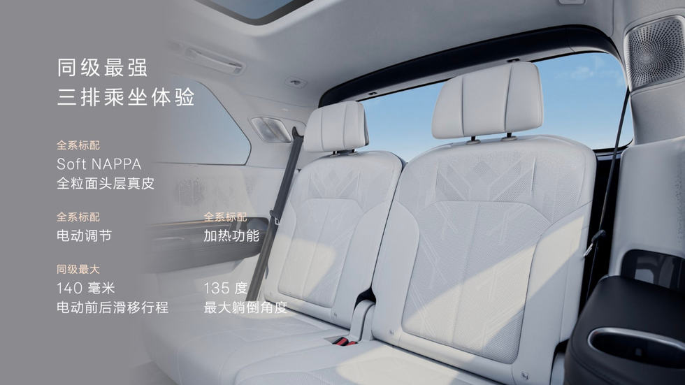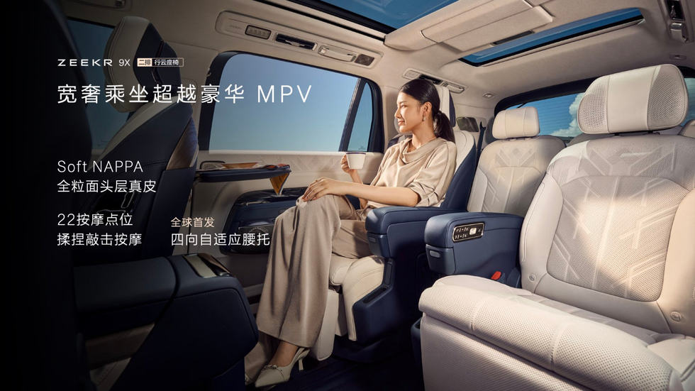 第三排同樣不打折。極氪9X采用一體式壓鑄后端鋁車身與強化CD柱結構來保護碰撞安全,能承受時速105公里的追尾與側碰沖擊。第三排還擁有同級最強的乘坐體驗,最大135度躺倒角度與同級最大140毫米電動滑移行程,加上專屬獨立天窗與“坐坐高升”布局,讓第三排成為通透明亮的陽光房。