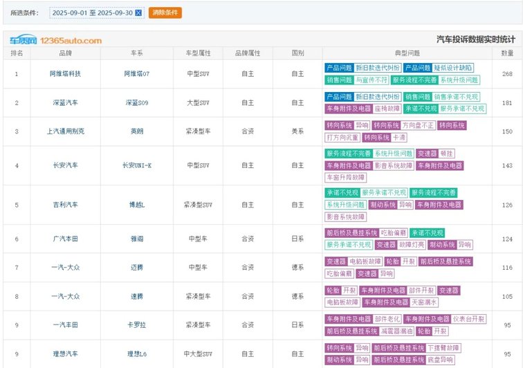 9月車型投訴排行榜出爐,阿維塔07奪冠,理想L6入榜